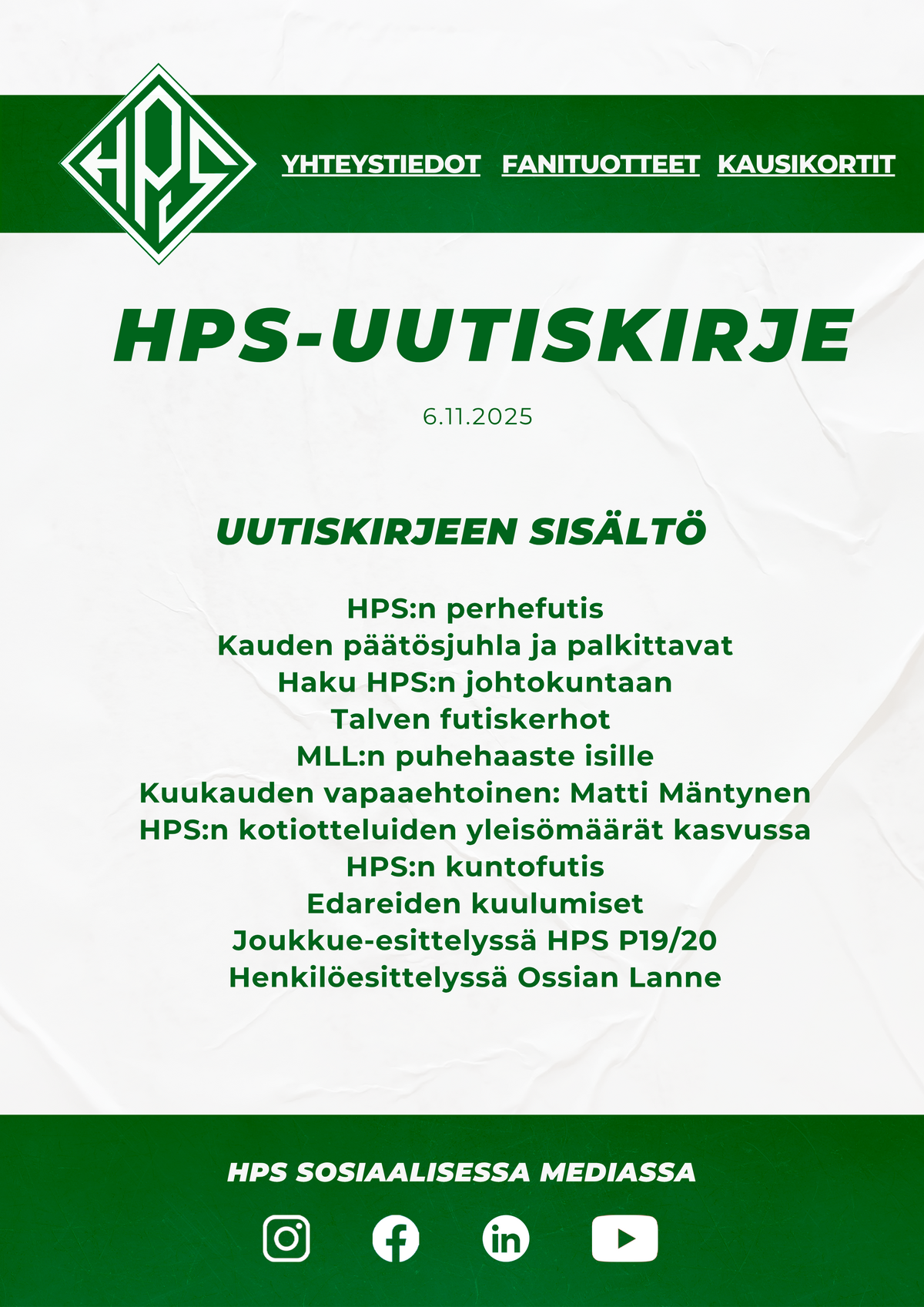 Uutiskirjeessä viestitään HPS:n jäsenille seuran ajankohtaisista asioista, esitellään seuran päivittäistä toimintaa ja kerrotaan edareiden kuulumisia kulissien takana.