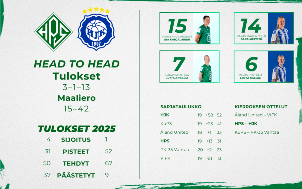 Edellisellä kierroksella perjantaina 19.9. PK-35 Vantaa oli Myyrmäessä vahvempi 3–0, mutta sitä ennen HPS kaatoi VIFK:n vakuuttavasti 5–0. Sarjaa on jäljellä enää viisi kierrosta ja HPS taistelee tiukasti mitalisijoista: ero kolmantena olevaan Åland Unitediin on vain kaksi pistettä. Taistelu mitalista käy nyt siis kuumimmillaan.